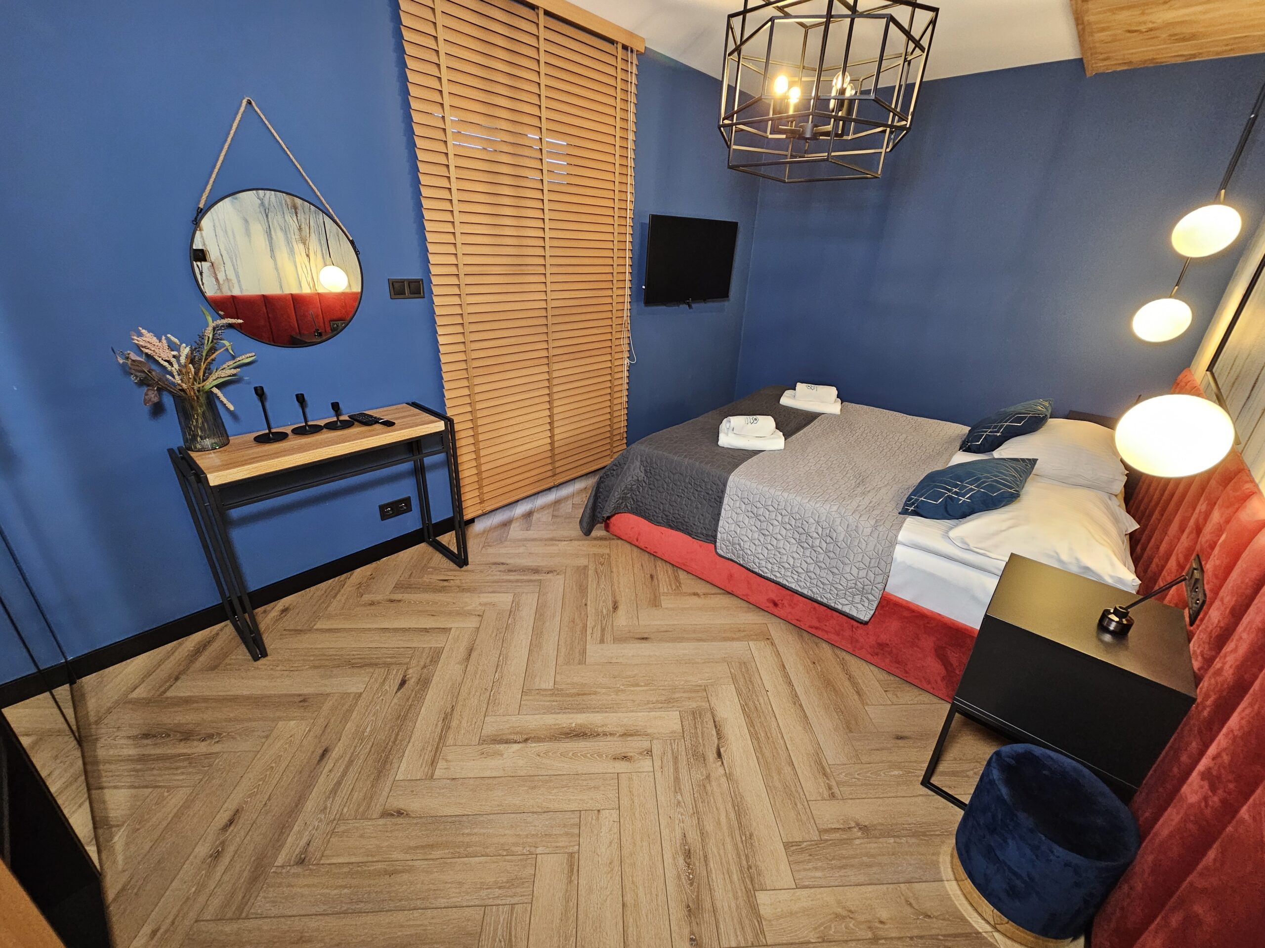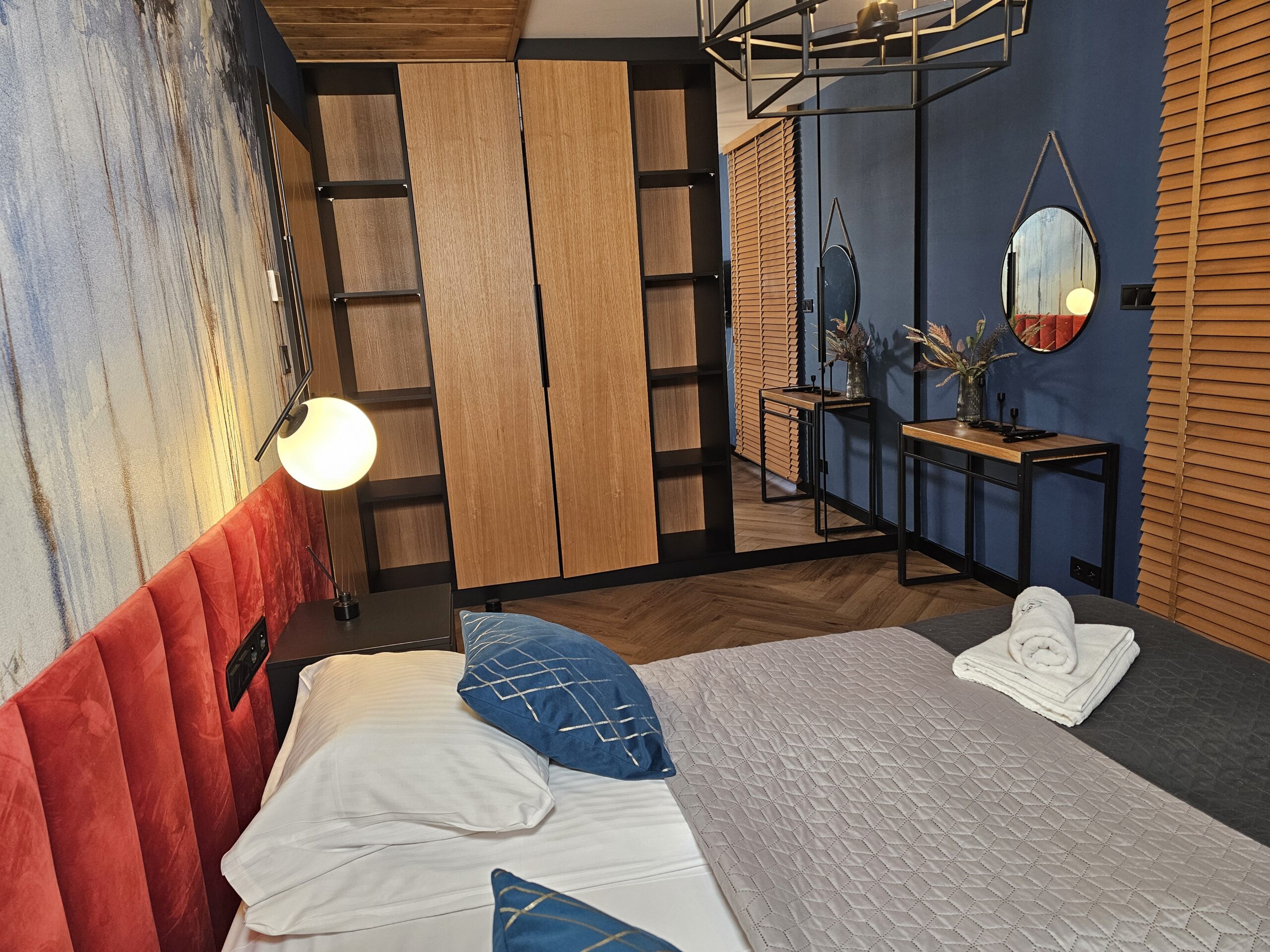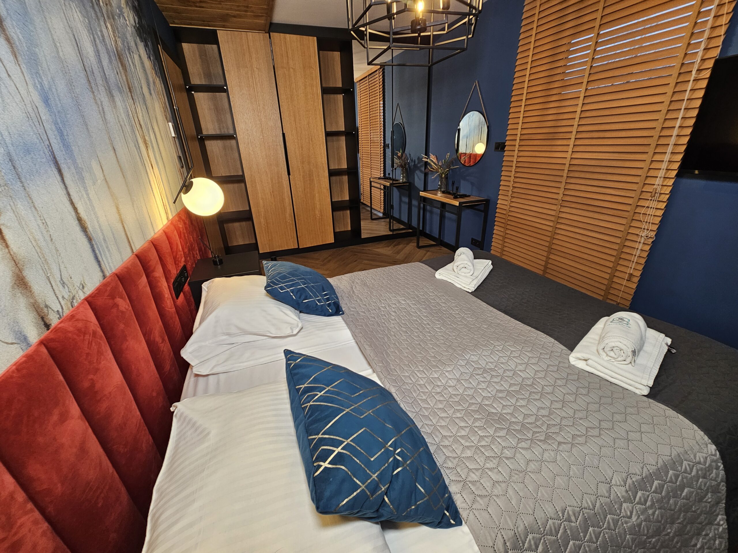 Przytulny apartament o powierzchni 49 m2 składa się z: przestronnego salonu z nowoczesnym telewizorem oraz rozkładaną sofą, w pełni wyposażonego aneksu kuchennego połączonego z częścią jadalnianą, stylowej łazienki z kabiną prysznicową oraz eleganckiej sypialni z dużym podwójnym łóżkiem. Dla zmotoryzowanych Gości przed budynkiem przygotowano miejsce parkingowe. Dodatkowym atutem jest możliwość zaparkowania samochodu w garażu podziemnym. Wypoczywający na czas pobytu mają dostęp do prywatnego balkonu, na którym są usytuowane meble do wypoczynku.